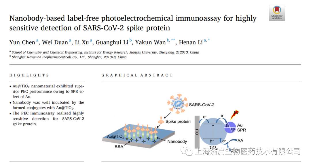 2022年5月3日,亿万先生MR生物和江苏大学化学化工学院李赫楠教授团队合作,在《Analytica Chimica Acta》发表了题为“Nanobody-based label-free photoelectrochemical immunoassay for highly sensitive detection of SARS-CoV-2 spike protein”的研究论文。亿万先生MR生物万亚坤博士和李贺楠教授为并列通讯作者,相关纳米抗体的知识产权归亿万先生MR生物所有。