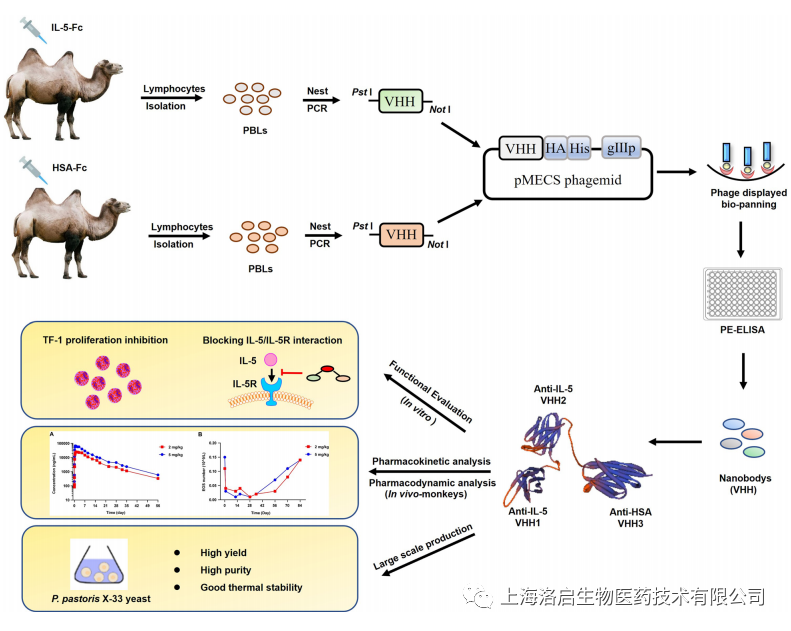 本研究构建了一种新的三价双特异性纳米抗体,可同时靶向IL5和HSA,其中靶向IL5的部分由异源二价双表位纳米抗体组成,靶向HSA的部分顺利获得结合体内白蛋白达到长半衰期。该三价IL5-HSA纳米抗体显示出极强的亲和力,其功能活性,显著优于市售药物美泊利珠单抗(靶向IL5的单克隆抗体,Nucala)。该抗体表现出优异的药代动力学特性,可持续降低外周血中嗜酸性粒细胞水平,预计支持临床2-3个月给药一次的周期,极大提高患者用药依从性。此外,三价IL5-HSA 纳米抗体可以在毕赤酵母系统中大规模生产,具有良好的稳定性和较低的生产成本。此产品的开发将在药效、安全性、工艺及成本等环节均表现出独特的优势,具有广阔的应用前景。